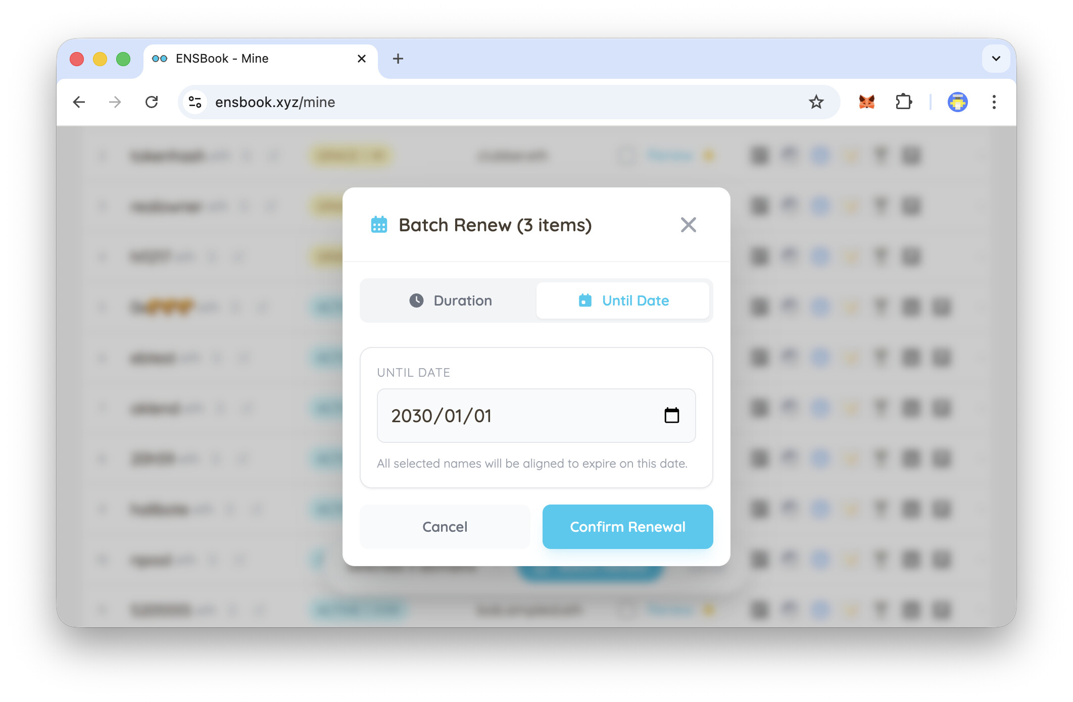 It enables features like “Renew Until…”, where users can select a target date, and the frontend calculates the specific duration required for each name to align their expiry dates perfectly.