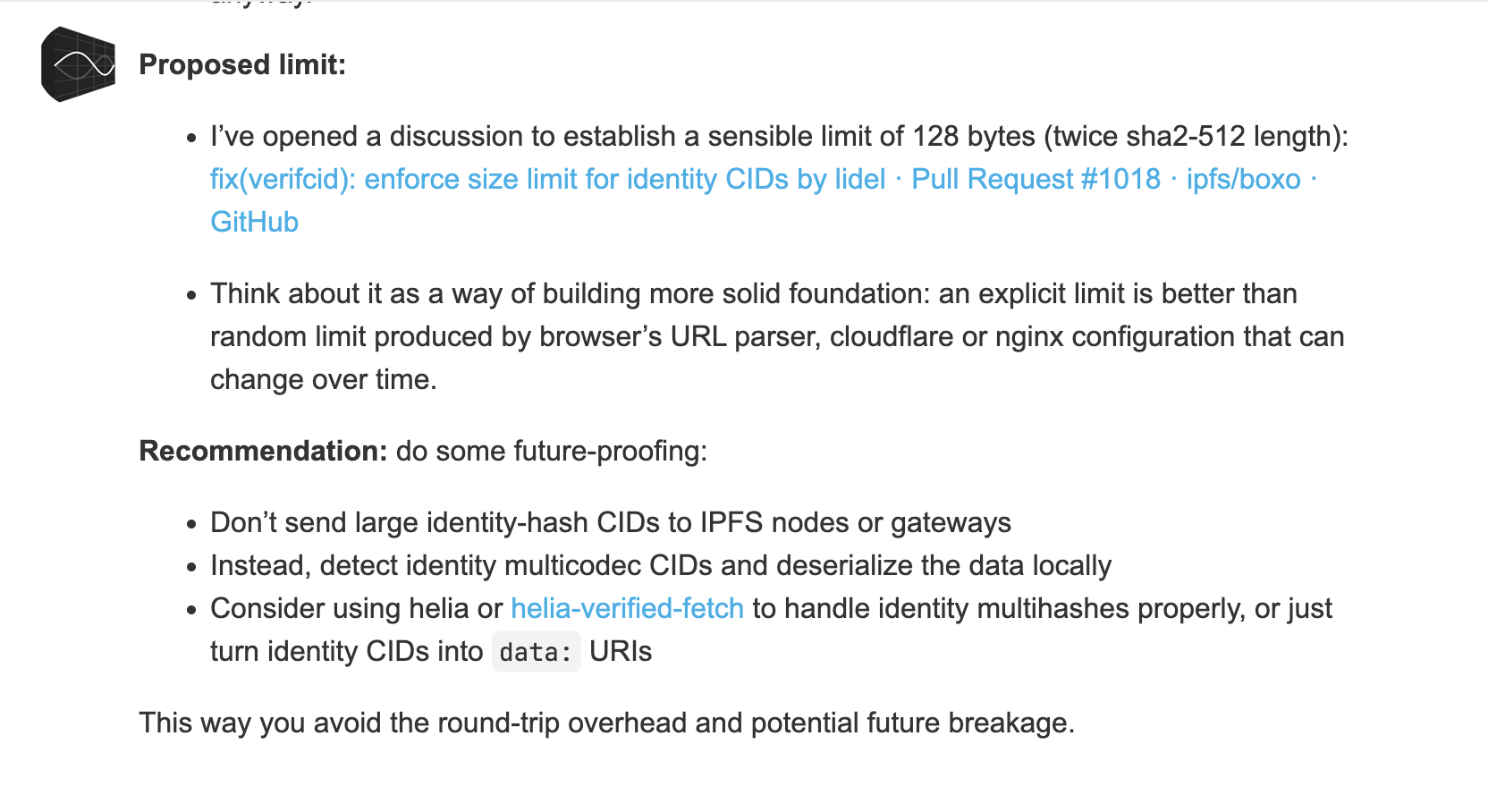 I’m posting this under context as fix(verifcid): enforce size limit for identity CIDs by lidel · Pull Request #1018 · ipfs/boxo · GitHub was merged in sept and there’s clear specs for how much data can we inline with raw/identity, 2x of sha512 hash = max 128 bytes including cidv1 prefix.