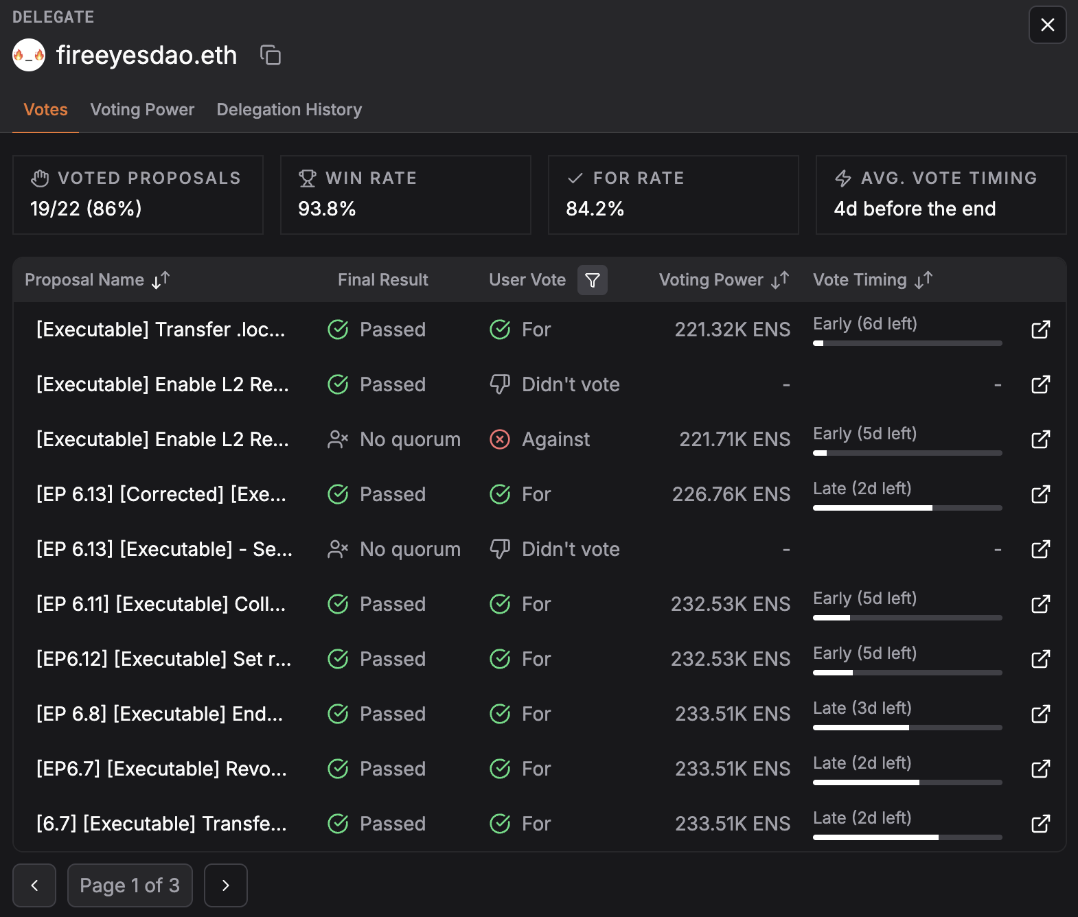 It offers a clear view of governance by combining token holder and delegate information with metrics like average vote timing, percentage of “for” votes, token balance variation, delegation changes, delegator balance increase and decrease, voting power, proposals voted on, and many more.