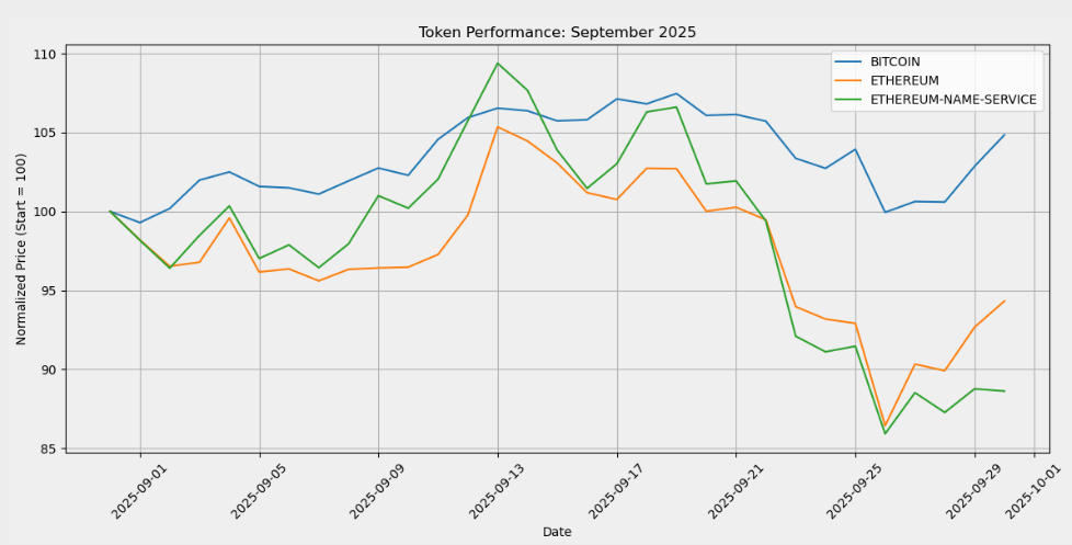 The ENS token’s price dropped -11.38% in September, underperforming both BTC (+4.85%) and ETH (-5.68%) as crypto majors siphoned liquidity from smaller-cap tokens.