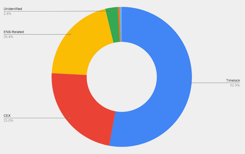 Token holder distribution across the top-50 ENS token holders remains relatively unchanged, and concentrated in the hands of centralised exchanges (‘CEXs’) and ENS-related wallets (DAO, ENS Labs, etc.).