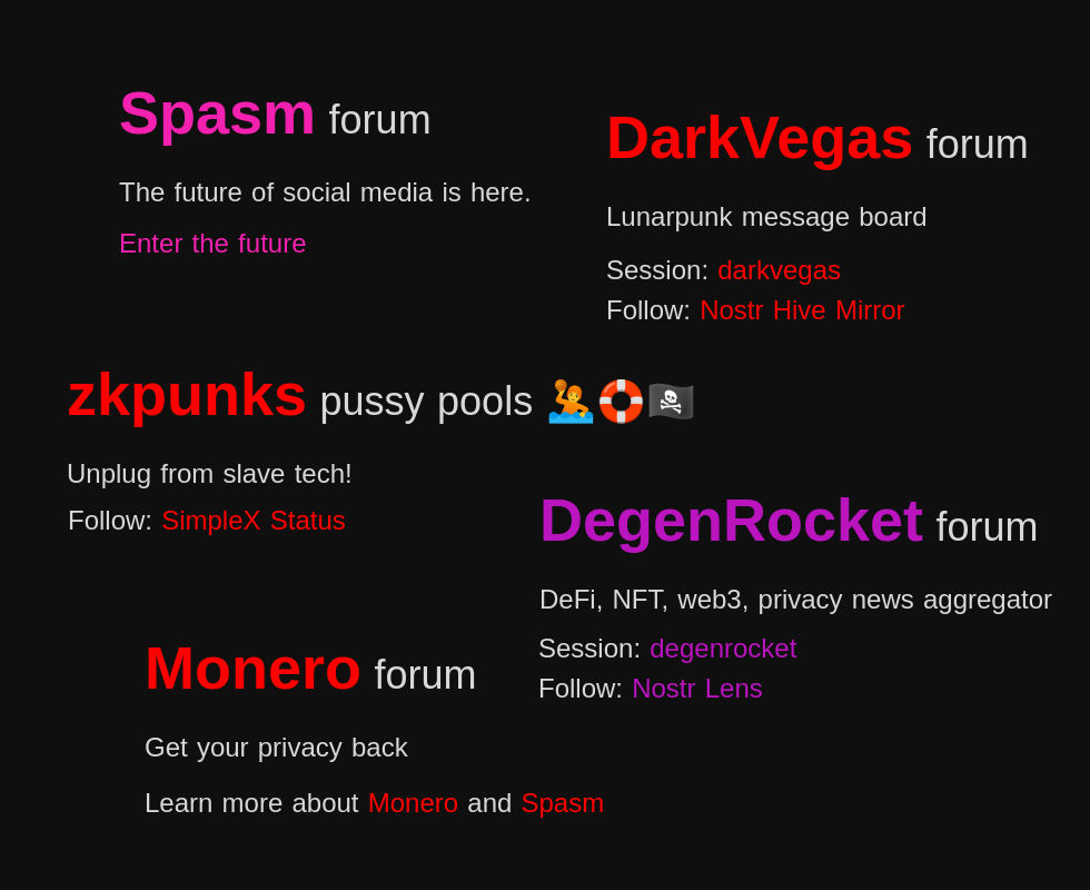 Keep in mind that a Spasm-powered forum is just one app, but you can build anything you want with Spasm, so eventually everything gonna run on Spasm, from forums to social graph-based apps like Twitter, as well as messaging apps like Telegram, code-sharing platforms like Github, package managers like NPM, agent-to-agent communication protocols, and whatever else you can only imagine.