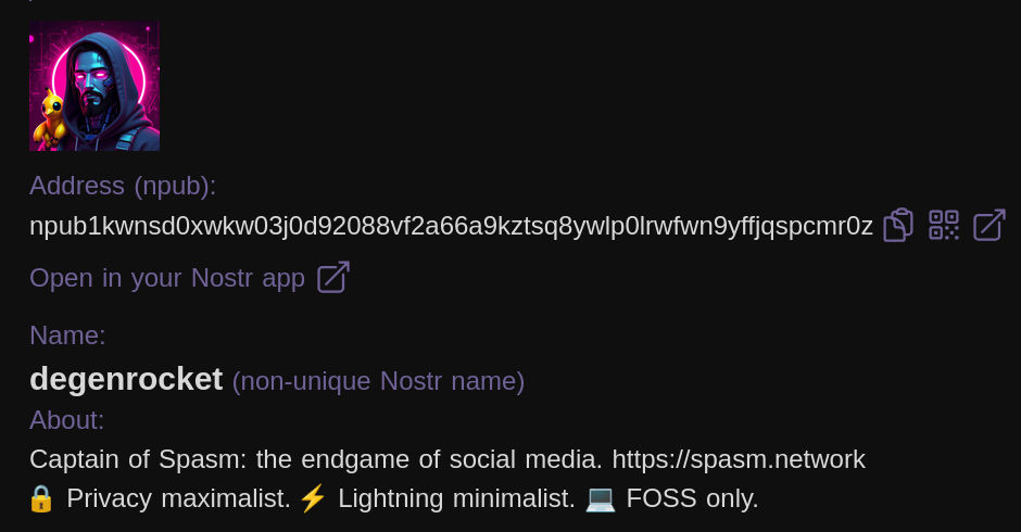 However, if you open an Ethereum profile of the same author, you will see a boring page with no user-specified info, even though the Ethereum private key was integrated into Spasm in 2021, long before the Nostr private key.