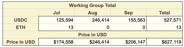 The USD equivalent of total Working Group spending for Q1 was $642k. USD price conversions for ETH are made using end-of-day pricing sourced from CoinGecko. The price of USDC is hard coded as $1. Numbers in diagrams are rounded to the nearest thousand.