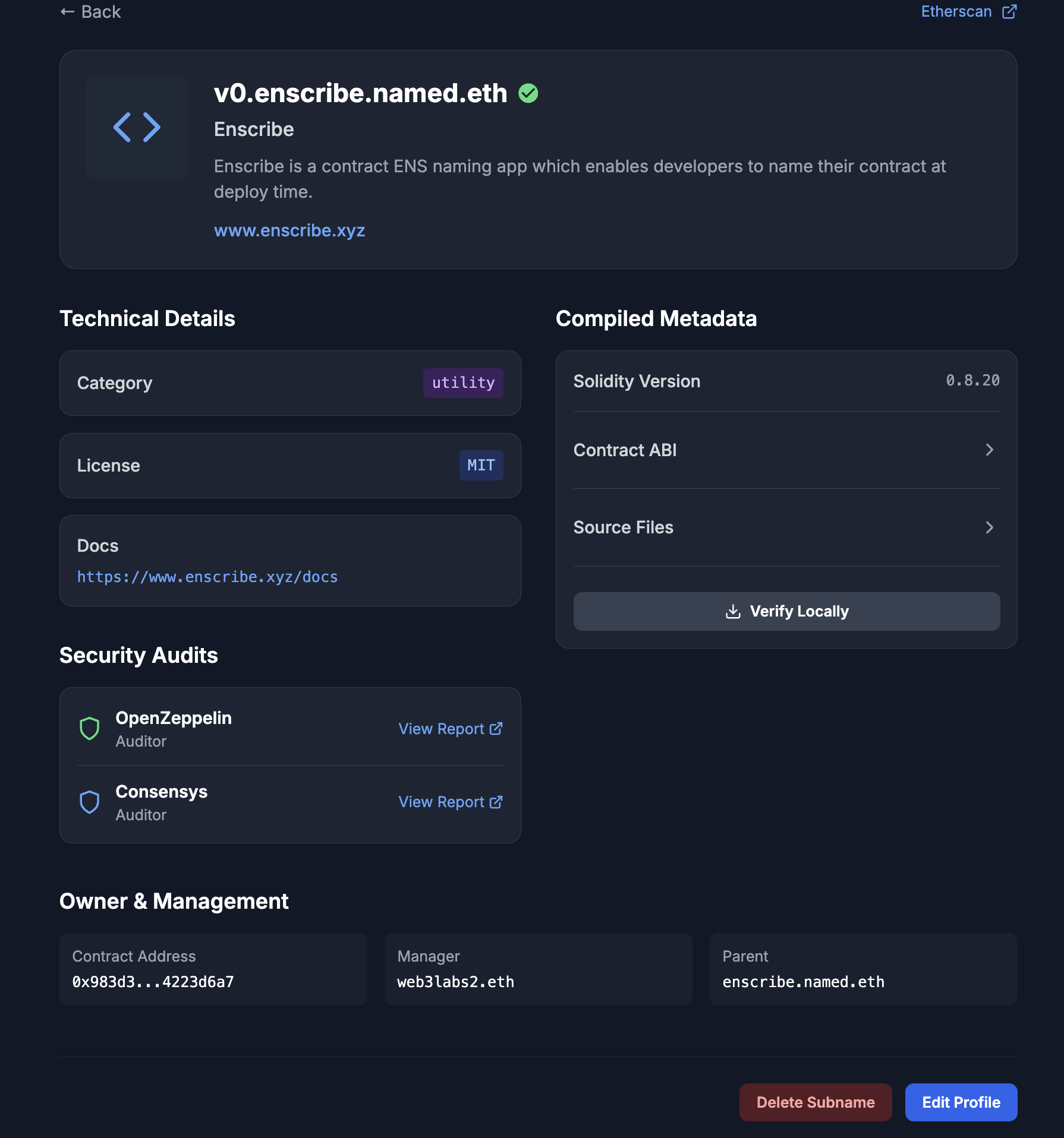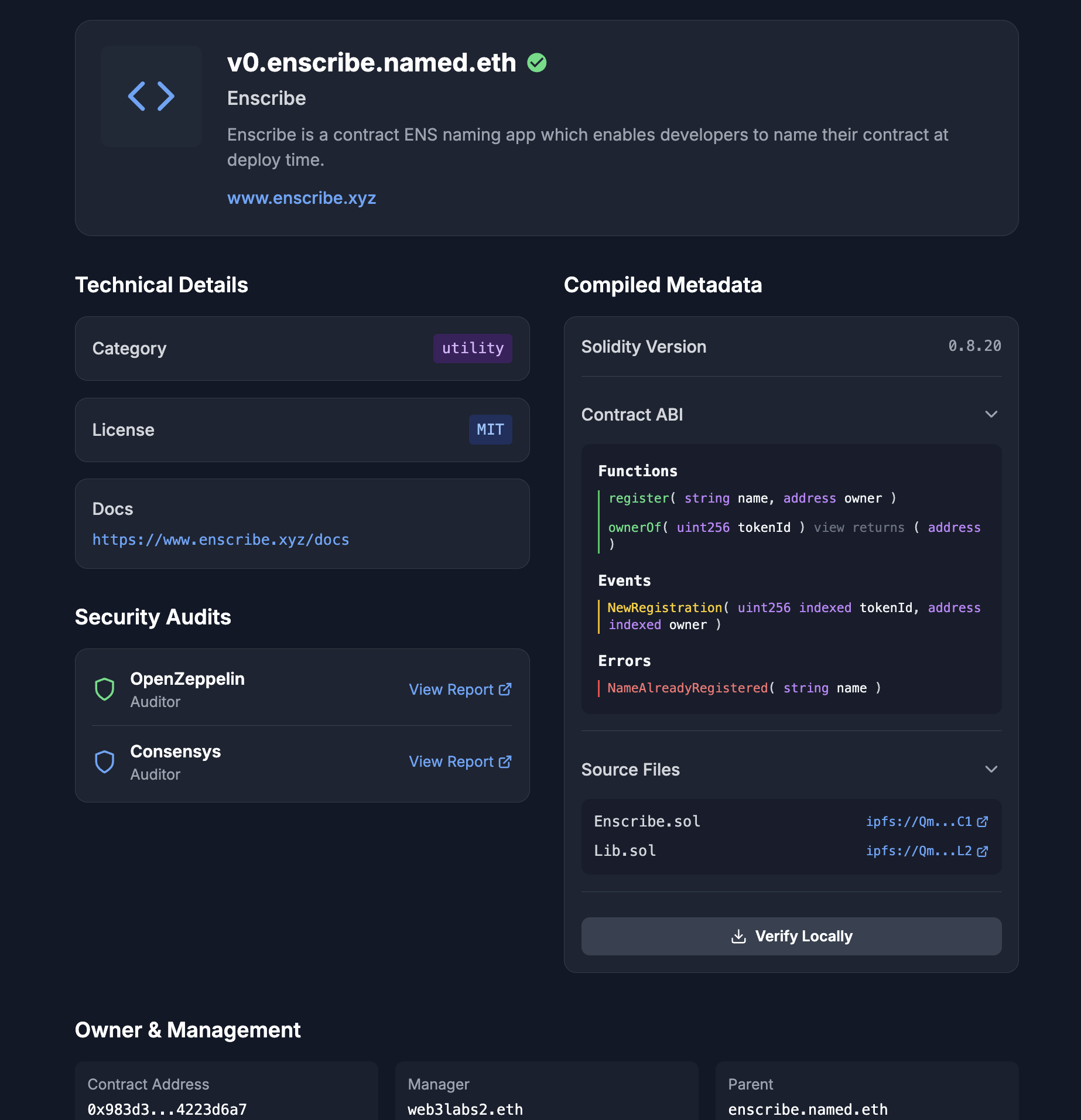 We at Enscribe have submitted a new ENSIP proposal that extends ENS functionality for smart contracts by establishing a comprehensive metadata standard. The proposal defines standardized text records and a new compiled-metadata resolver profile specifically designed for smart contract information.
