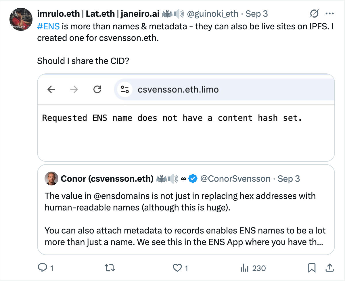 Currently, ENS is primarily used for EOA naming and user profiles, with limited adoption for contract-related metadata. While ENSIP-4 allows storing ABIs, smart contracts need much more comprehensive metadata including source code verification, audit reports, documentation links, and licensing information.