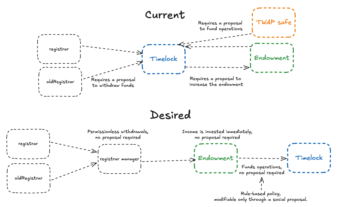 With this proposal, capital flows from registrars to the endowment as soon as anyone calls withdraw(). The endowment begins generating yield immediately rather than after several months of governance overhead. Operational funding follows a clear quarterly process based on the two-year runway target, removing the need for ad-hoc proposals.