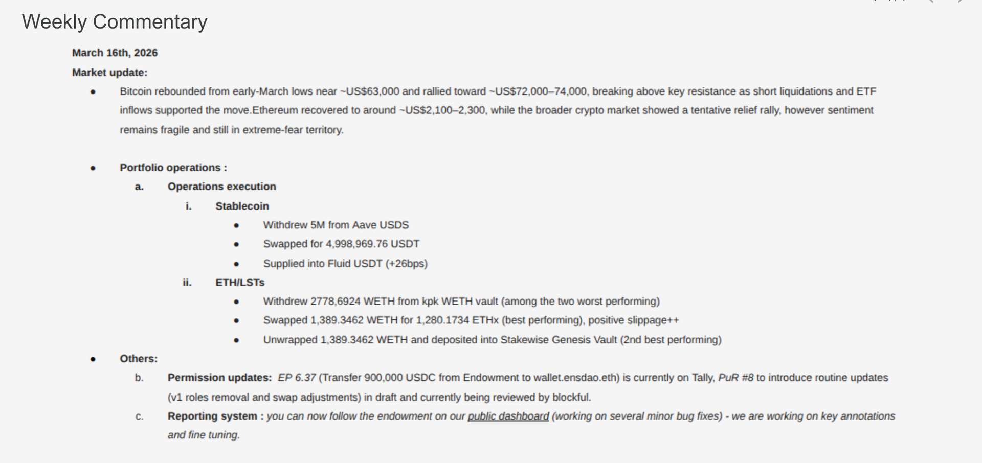 - Weekly summary performance for the endowment