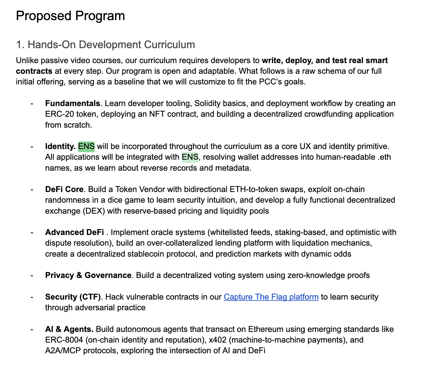 Read the entire draft – Ethereum Developer Program for PCC. We advocated for a dedicated ENS section to emphasize identity as a foundational layer of Web3.