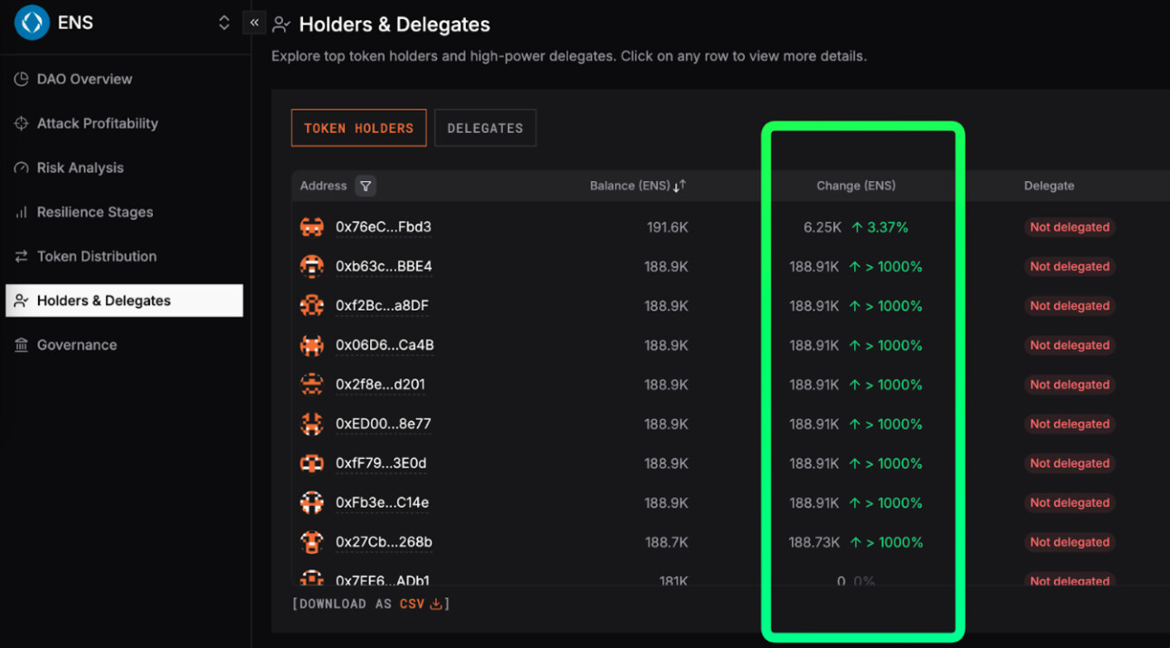 In other words, the voting power held by the addresses that experienced a sudden increase in ENS balances over the last 30 days is nearly double the DAO’s active voting power. It would take 56% of all delegated votes to block a malicious proposal if these addresses were to submit it and vote in favor.