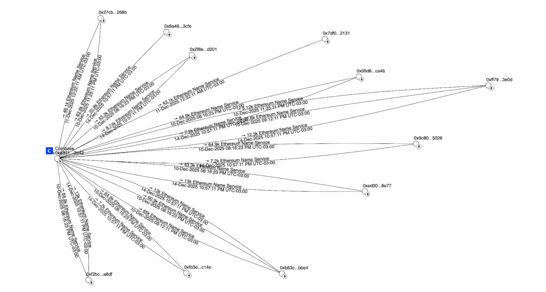 We identified a total of ~2.4M ENS across 13 addresses holding more than 100,000 ENS whose balances increased from 0 over the prior 30 days. Within this set, 11 addresses appear “connected” under a single heuristic: they received ENS sourced from Coinbase in the same block (or via tightly clustered Coinbase batch transactions).