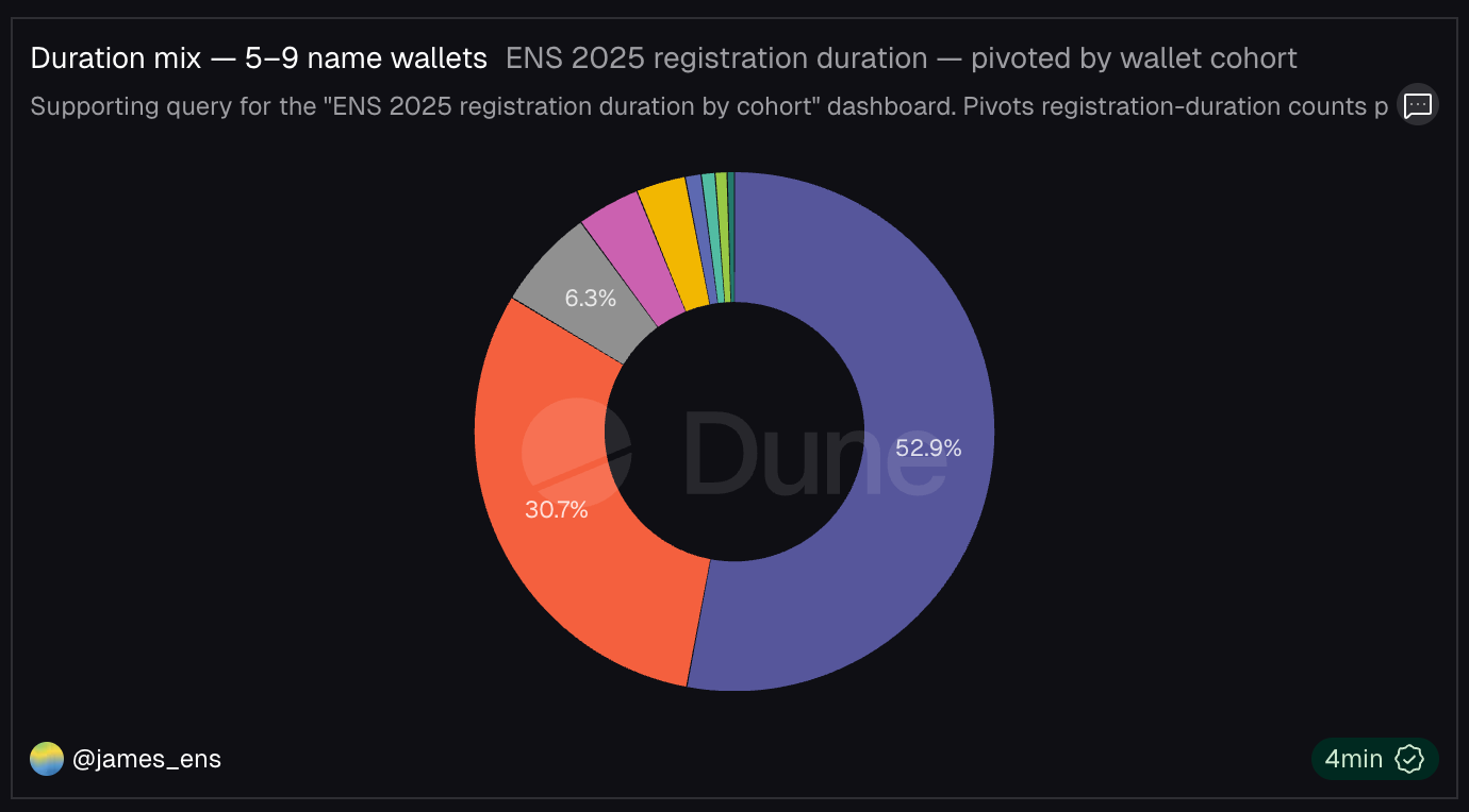 More than half (52.5%) of wallet addresses with 5-9 names register for less than a year. Multi-year discounts shift the fee burden in aggregate away from the cohort that registers greater than a year (more on that below).