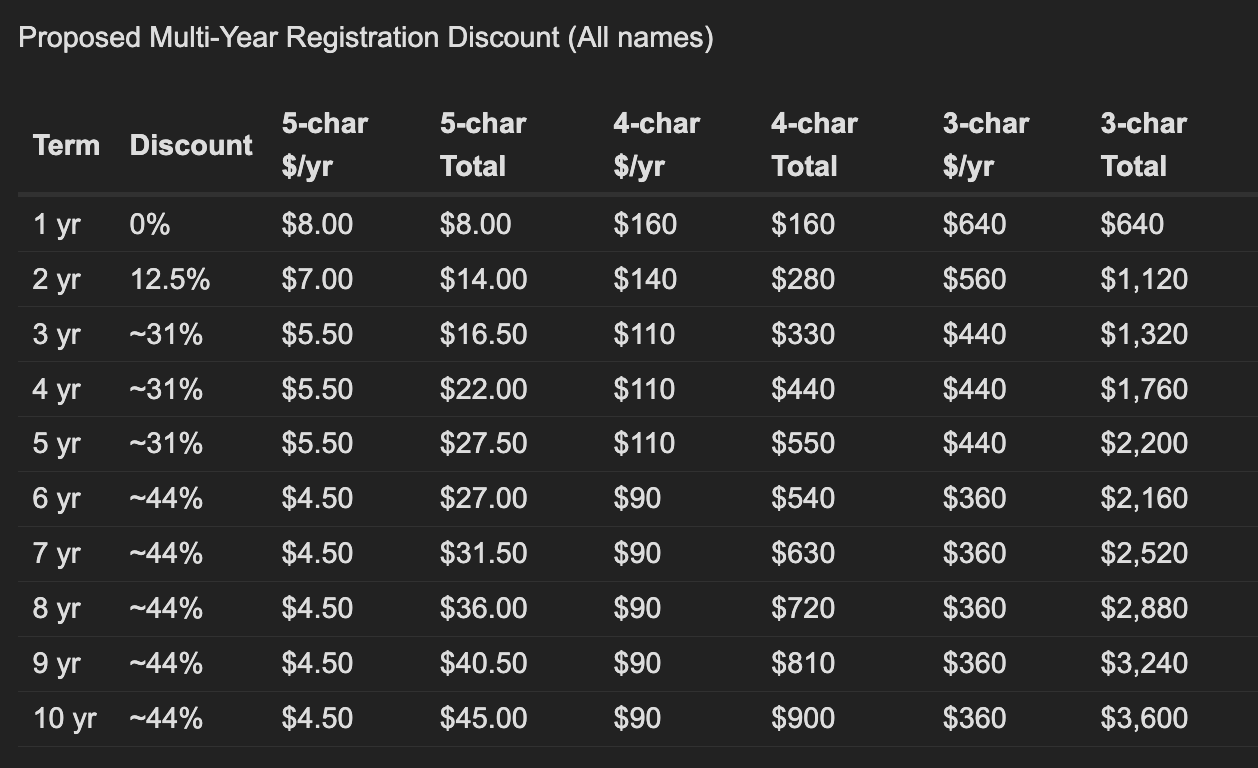 Multi year discounts not only cater to people with more capital, but incentivizing 50% discounts on 10 years will sooner or later lead to a bunch of names being locked out for a decade because some people wanted to save on extension costs and then got rekt - losing their identity for a decade. Imagine another 2021-esque hype bubble - aka a time where people were making “my apes are gone” posts on a daily basis - but with their identity. “My identity is gone. For a decade.”